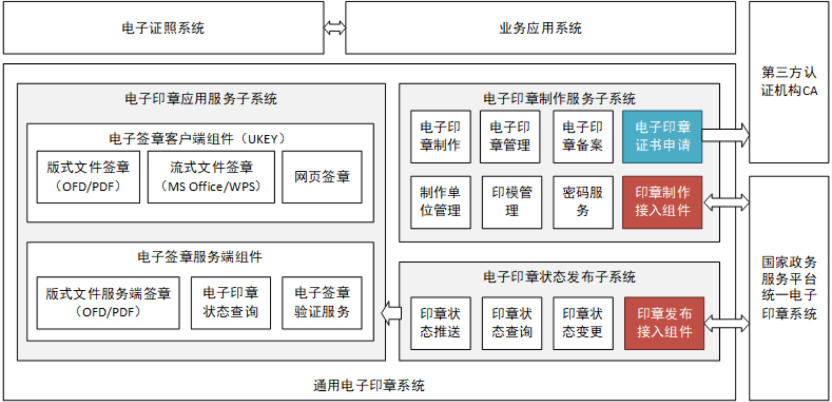 通用电子印章系统提供电子印章的申请、审批、制作、备案、维护管理(包括查看、注销、停用、恢复、变更、日志记录等操作)、签盖、验证、查询等功能和服务,负责电子印章或其数字证书的基本信息和各种状态发布。