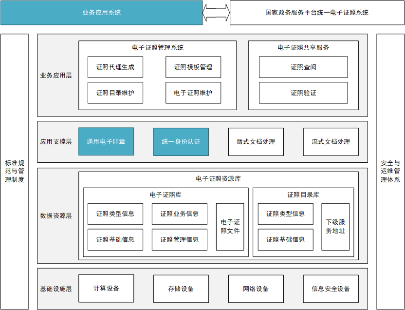 该系统提供电子证照的代理生成、签章、套打、证照类型管理、证照模板管理、目录维护、证照管理、共享交换、检索、查阅、获取、验证、原件下载、加注件制作、加注件下载等电子证照管理功能和共享服务,提供电子证照的状态管理功能,提供身份认证、日志记录和追溯、审计功能。